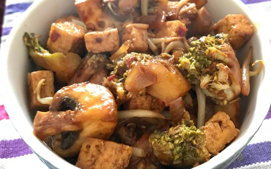 Gemüse eurer Wahl lange und sanft anbraten. Z.B. Brokkoli, Champignons, Zucchini und Sojasprossen. Wer will kann auch Tofu reinpacken.