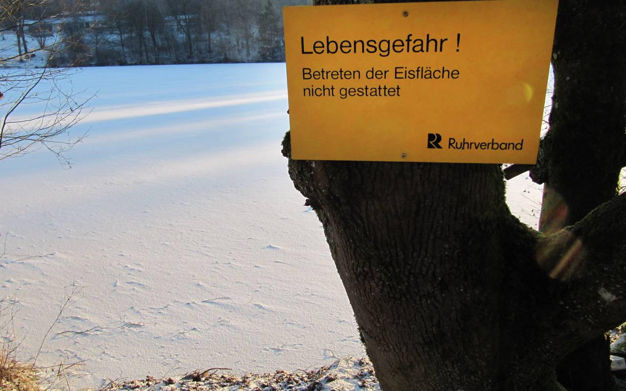 Auch sollten wir uns und den Kindern noch einmal deutlich machen, dass Eisflächen auf zugefrorenen Gewässern nicht betreten werden sollten, weil das lebensgefährlich sein kann, warnen Feuerwehr und Ruhrverband. Trotz der eisigen Temperaturen könnten die Eisflächen einbrechen. Erst ab einer Dicke von 20 Zentimetern sind solche Flächen sicher genug. Wer einbricht, dem bleiben nur wenige Minuten, um sich aus dem Eis zu retten. Dann sollten wir uns liegend und mit gespreizten Armen und Beinen über die Eisfläche ans Ufer bewegen, rät die Feuerwehr.
