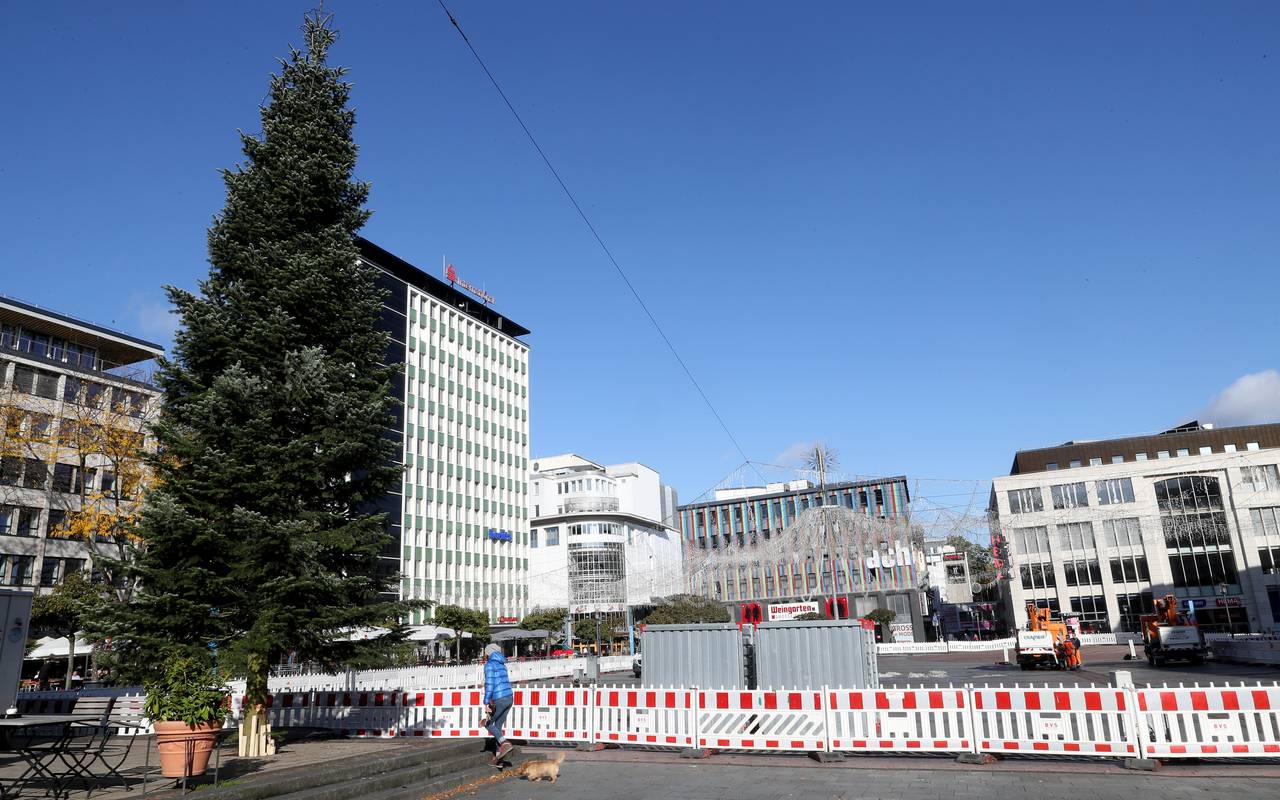 In der Essener Innenstadt steht schon die riesige Tanne für den Weihnachtsmarkt. Wir mussten sie gestern schon auf dem Kennedyplatz aufstellen, sagt das Essener Stadtmarketing. Der Laster mit dem 15 Meter langen Baum wäre die nächsten Tage nicht mehr durchgekommen. Der Aufbau der Weihnachtsmarkt-Hütten startet.