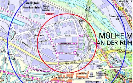 Im blauen Kreis, der Sicherheitszone, müssen sich alle Betroffenen luftschutzmäßig verhalten. Sie dürfen sich nicht draußen aufhalten und müssen drinnen die Fenster geschlossen halten. In diesem Bereich kann der Verkehr aber weiter rollen. Während die Weseler Straße in der Evakuierungszone gesperrt wird können Autofahrer also über die Duisburger Straße ausweichen. Der Nahverkehr darf in der Sicherheitszone nicht halten und muss durchfahren.