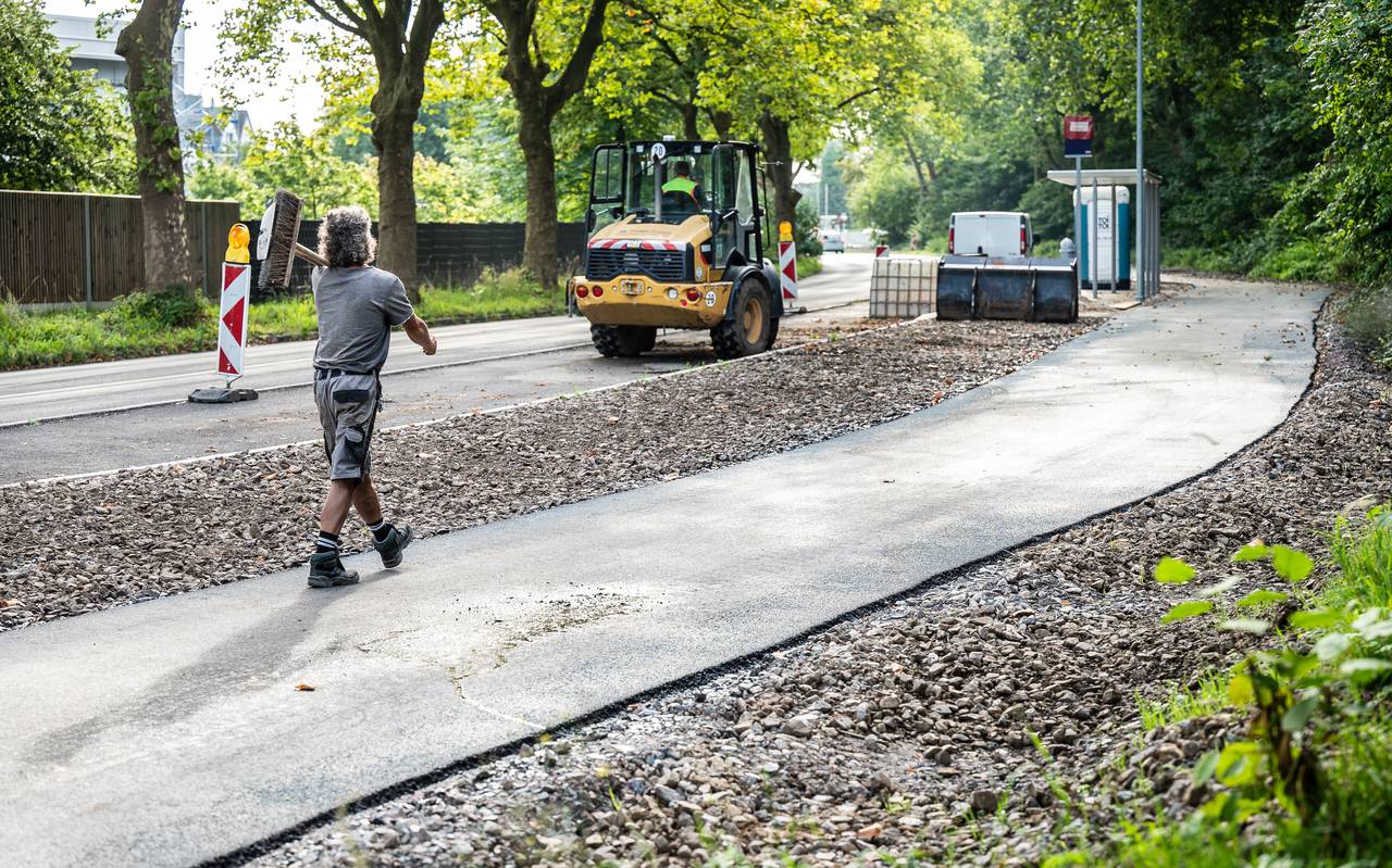 Der Bau des Rad- und Gehwegs an der Zeppelinstraße schreitet voran. Ein weiterer Kreuzungsbereich auf der ehemaligen Trasse der Straßenbahn ist fast fertig.