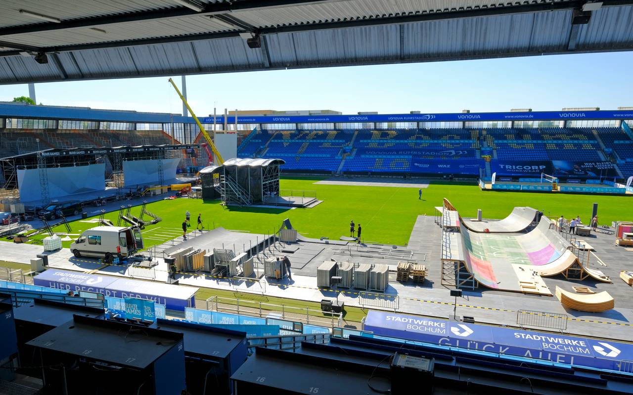 Direkt nach dem Aufstieg des VfL Bochum haben die Aufbauarbeiten im Stadion begonnen. 40 Trucks haben Material angeliefert. Außerdem kamen nein Sattelzug-Ladungen Sand für das Beachvolleyballfeld. Im Stadion gibt es u.a. eine 40 Meter breite Boulder- und eine 17 Meter hohe Speedkletter-Wand. Auf 5.000 Quadratmetern haben die Monteure Bodenschutzplatten aufgebaut. Zu dem Bereich gehören auch die Anlagen für Skateboard- und BMX-Fahrerinnen und Fahrer, sowie Judo und Stabhochsprung. Für das wegen der Pandemie ausgeweitete Streaming mussten vier Kilometer zusätzliche Datenleitungen verlegt werden.