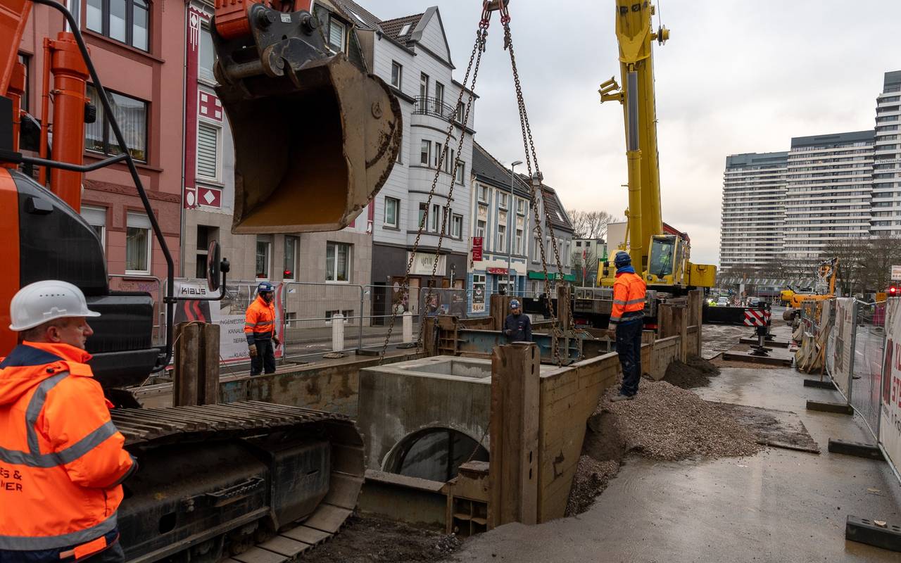 Wegen guter Rahmenbedingungen soll die Baustelle nun schon Mitte dieses Jahres fertig sein. Heute (27.01.) konnten die Arbeiten für die Verbindung mit dem ersten Bauabschnitt begonnen werden. Dazu wurden in den frühen Morgenstunden große Fertigteile aus Beton angeliefert. Sie müssen jetzt noch im Bereich kurz vor der Kreuzung Kämpchenstraße betoniert werden. Für den neuen Rumbach gibt es damit erstmals einen Durchgang zwischen Kaiserplatz bis zur Kreuzung Essener Straße / Walkmühlenstraße. Die Baumaßnahme zum 3. Bauabschnitt geht noch weiter. In den nächsten Wochen wird noch der letzte Teil des Mischwasserkanals im Bereich Tourainer Ring eingebaut. Der neue Rumbach ersetzt die alten, teilweise maroden Rohre und soll auch wieder Fische anlocken. Außerdem soll er künftig dafür sorgen, dass das Wasser bei Starkregen besser abfließen kann.